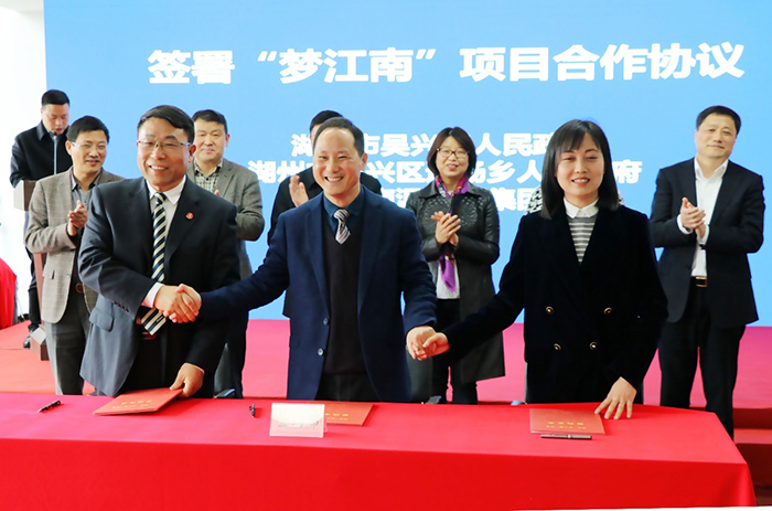 吳興區(qū)副區(qū)長朱建忠,道場鄉(xiāng)黨委副書記、鄉(xiāng)長王亞琪和金洲集團(tuán)、云南湄公河集團(tuán)董事長俞錦方簽署“夢江南”項目合作協(xié)議